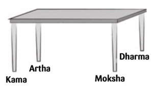 - Dharma : l’éthique, la morale intrinsèque, qui se met souvent en contradiction avec kama ou artha.